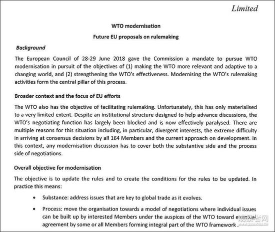 欧盟内部于上月底讨论出一份18页的"WTO改革方案",非常详细。该方案旨在盯防美国对WTO上诉机构的干预,以防WTO遭受"系统性瘫痪"。