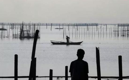 ▲9月13日,在菲律宾穆汀鲁帕市,一名男子在渔船上收网。(新华社)