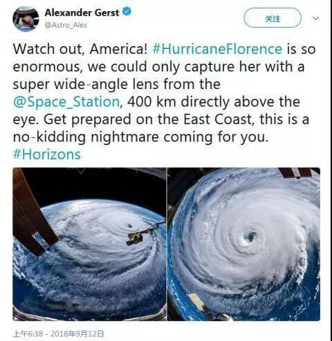 当地时间12日,德国宇航员盖斯特在社交网站上发布了从国际空间站俯瞰飓风"弗洛伦斯"的照片,巨大的风暴眼清晰可见。