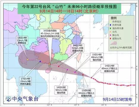 就在今天(14日)上午8点,"山竹"已经到达位于菲律宾马尼拉东偏北约660公里的西北太平洋洋面,中心附近最大风力17级以上(65米/秒)。