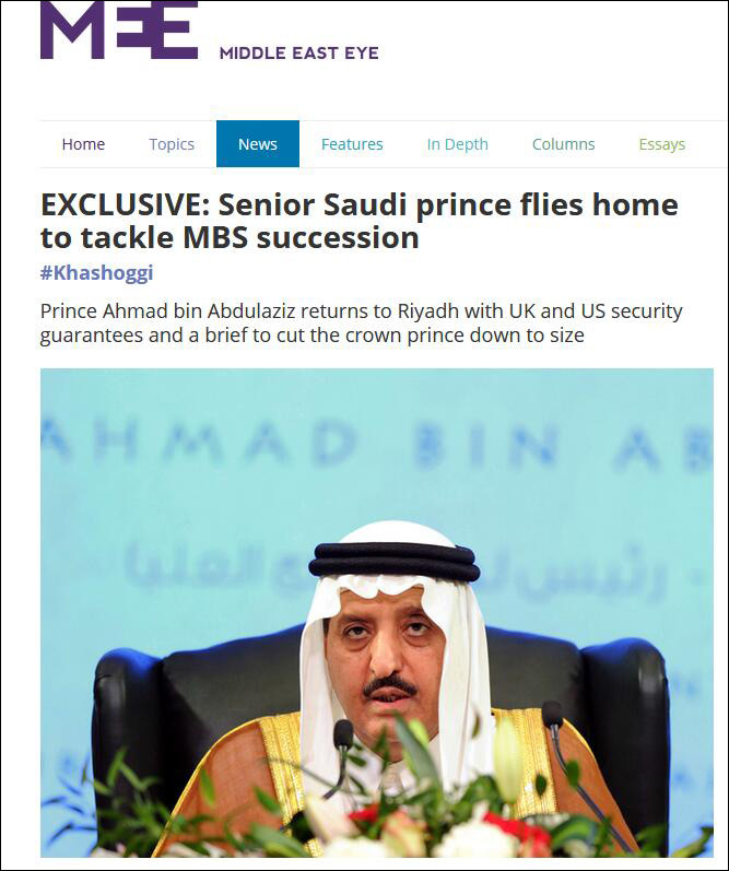 英国媒体10月31日放出独家消息,沙特国王萨勒曼的弟弟、长期偏居英国的艾哈迈德·本·阿卜杜拉阿齐兹(Ahmed bin Abdulaziz )亲王已经在美英的安全保证下回国,目的是处理记者卡舒吉遇害案后穆罕默德王储的继承问题。更有持异见的沙特王子表示,一场反对萨勒曼国王的政变"迫在眉睫"。