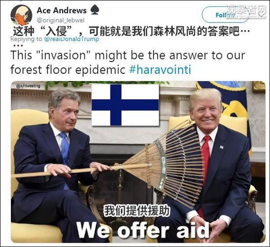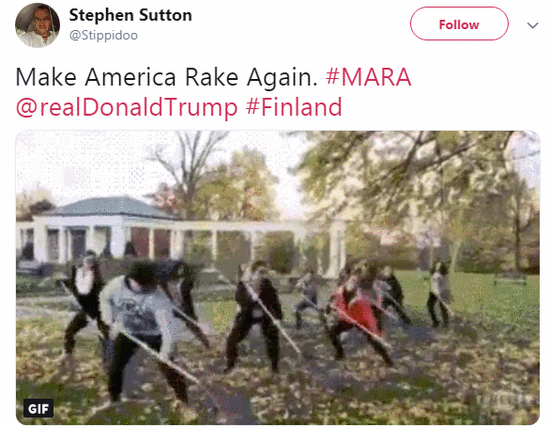 美国新闻网站“politico”表示,18日,尼尼斯托与特朗普发表矛盾消息的事在社交媒体上传开后,芬兰人在推特上发布了视频、照片,并配上了“#haravointi”这个词,翻译成英文就是“raking”(耙草)。