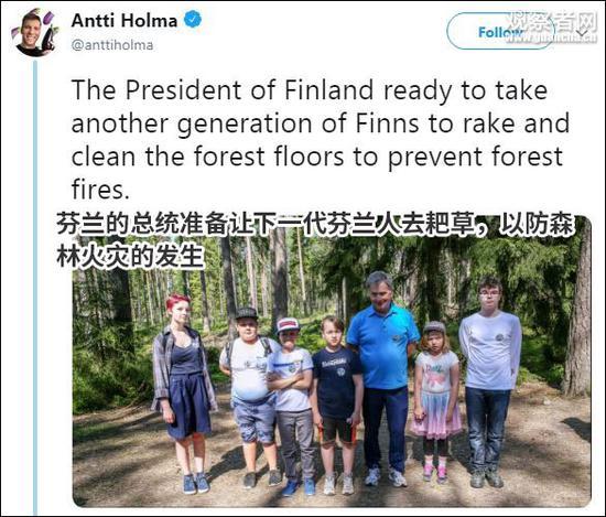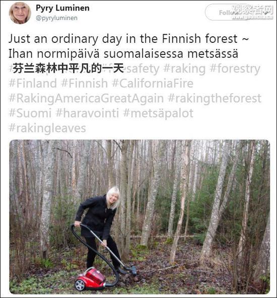特朗普引用了芬兰总统绍利·尼尼斯托(Sauli Niinist?)的话,“我当时和芬兰总统在一起,他说,我们有很大不同,我们是一个森林国家。他称之为森林国家……他们花很多时间耙草(raking,即用耙子扒垄地上的落叶、野草等,本文统称“耙草”),打扫、做事情,他们没有任何问题。当有问题时,也只是很小的问题。所以我知道每个人都在为此而努力。”