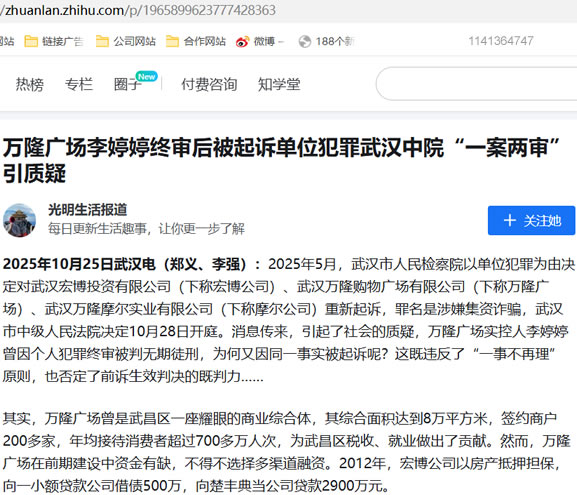 2025年10月25日武汉电(郑义、李强):2025年5月,武汉市人民检察院以单位犯罪为由决定对武汉宏博投资有限公司(下称宏博公司)、武汉万隆购物广场有限公司(下称万隆广场)、武汉万隆摩尔实业有限公司(下称摩尔公司)重新起诉,罪名是涉嫌集资诈骗,武汉市中级人民法院决定10月28日开庭。消息传来,引起了社会的质疑,万隆广场实控人李婷婷曾因个人犯罪终审被判无期徒刑,为何又因同一事实被起诉呢?这既违反了“一事不再理”原则,也否定了前诉生效判决的既判力……