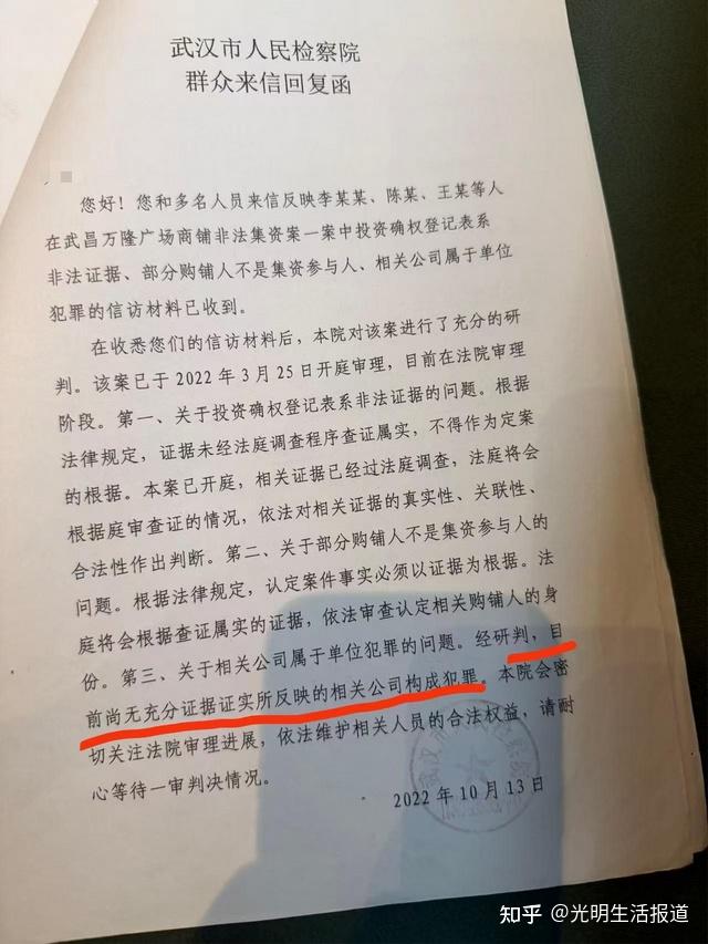 自相矛盾的是,2022年10月13日,武汉市人民检察院曾经下函,明确表明万隆广场集资一案不构成单位犯罪。法律专家认为,若真是单位犯罪成立的话,李婷婷以个人犯罪被判无期徒刑就是错案,就是对一个民营企业家的污蔑与摧残。