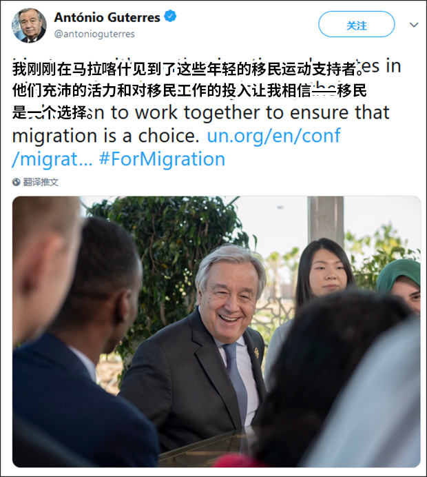 联合国秘书长古特雷斯在马拉喀什接见年起的移民运动支持者 推特截图